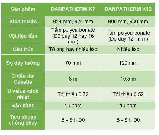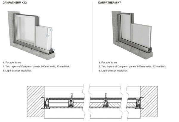 Bằng cách lắp đặt các tấm polycarbonate cách nhiệt, hệ thống Danpathern cung cấp giá trị U cách nhiệt thấp ( 0,52 W / m²K trong Danpatherm K12 và 0,72 W / m²K trong Danpatherm K7. )