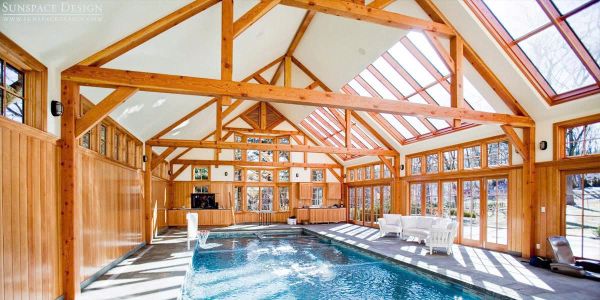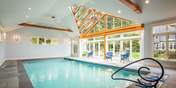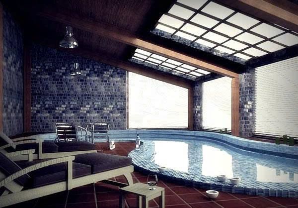 | Hồ bơi trong nhà với hệ khung kèo bằng gỗ tự nhiên và lắp tấm Polycarbonate đặc trong suốt cho hệ mái.Tạo cảm giác sang trọng và gần gữi thiên nhiên | Hồ bơi trong nhà với hệ khung kèo bằng sắt và lắp tấm lấy sáng Polycarbonate xám khói kết hợp với trần gỗ. Tạm cảm giác sang trọng, kín đáo, riêng tư |