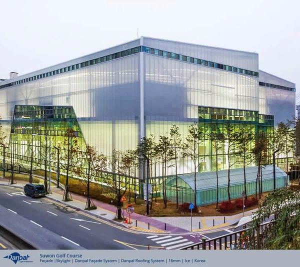 Một công trình sử dụng tấm lợp polycarbonate để làm giếng trời và mặt tiền cân bằng ánh sáng suốt cả ngày