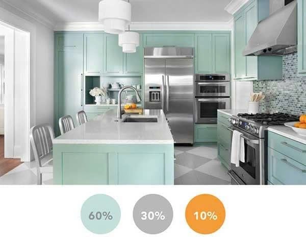 Nguyên tắc 60-30-10 được xem là nguyên tắc vàng trong thiết kế, đặc biệt là trong thiết kế nội thất. Theo nguyên tắc , chúng ta chỉ nên sử dụng tối đa 3 màu sắc (màu chủ đạo chiếm 60%, màu cấp 2 chiếm 30%, 10 % còn lại là màu nhấn mạnh.